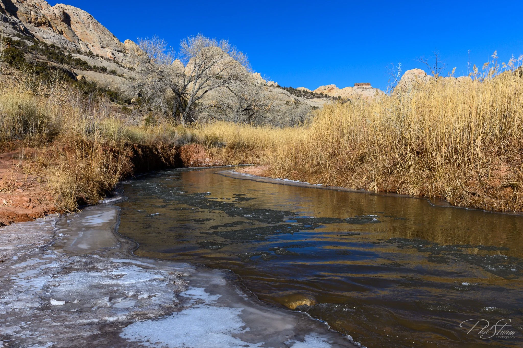 The Fremont River had an endless flow of broken ice floating along with the current.